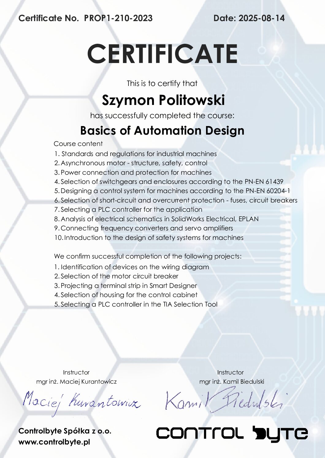 Here you will find all my certificates from trainings related to electrical engineering and industrial automation.
