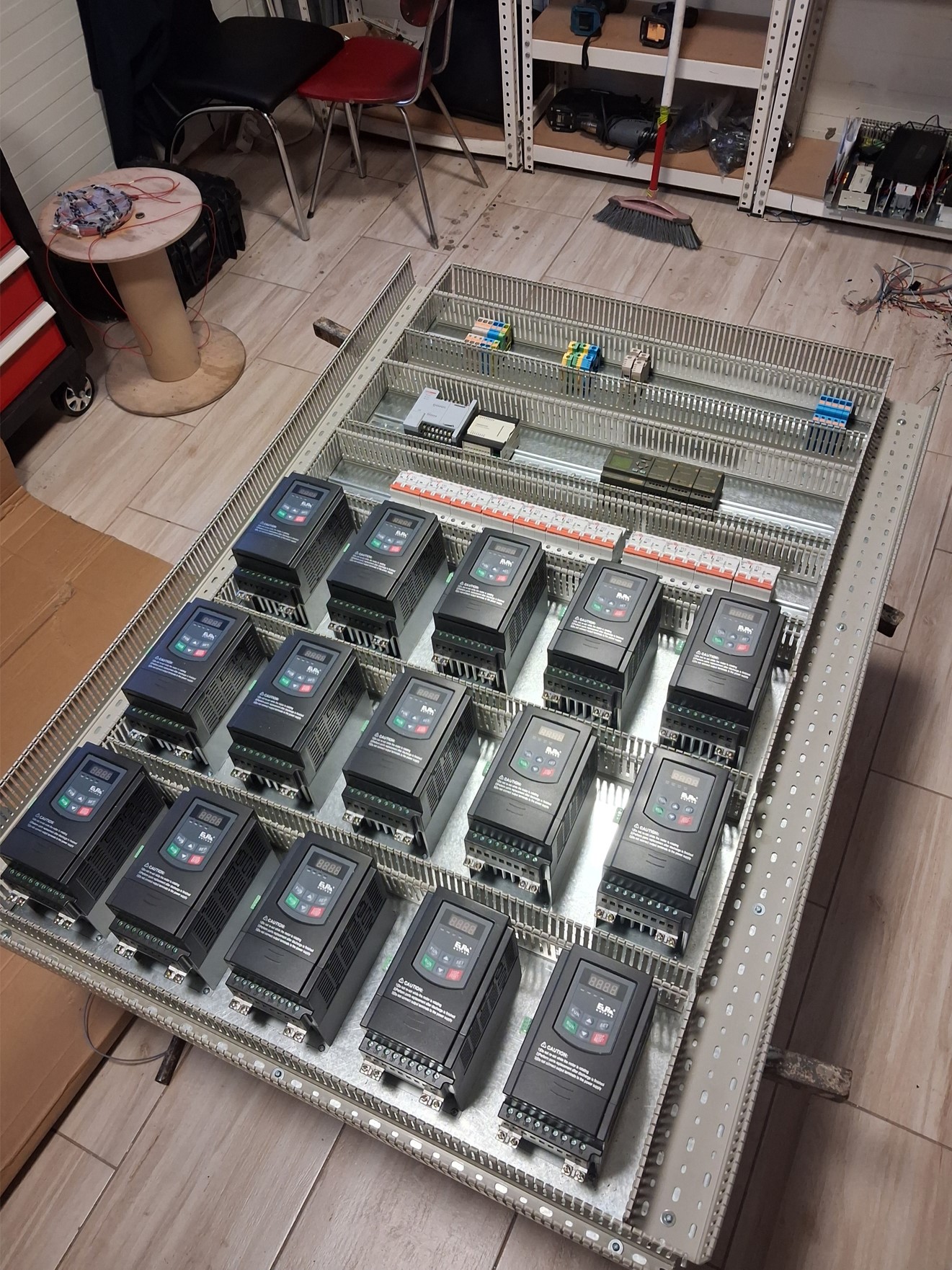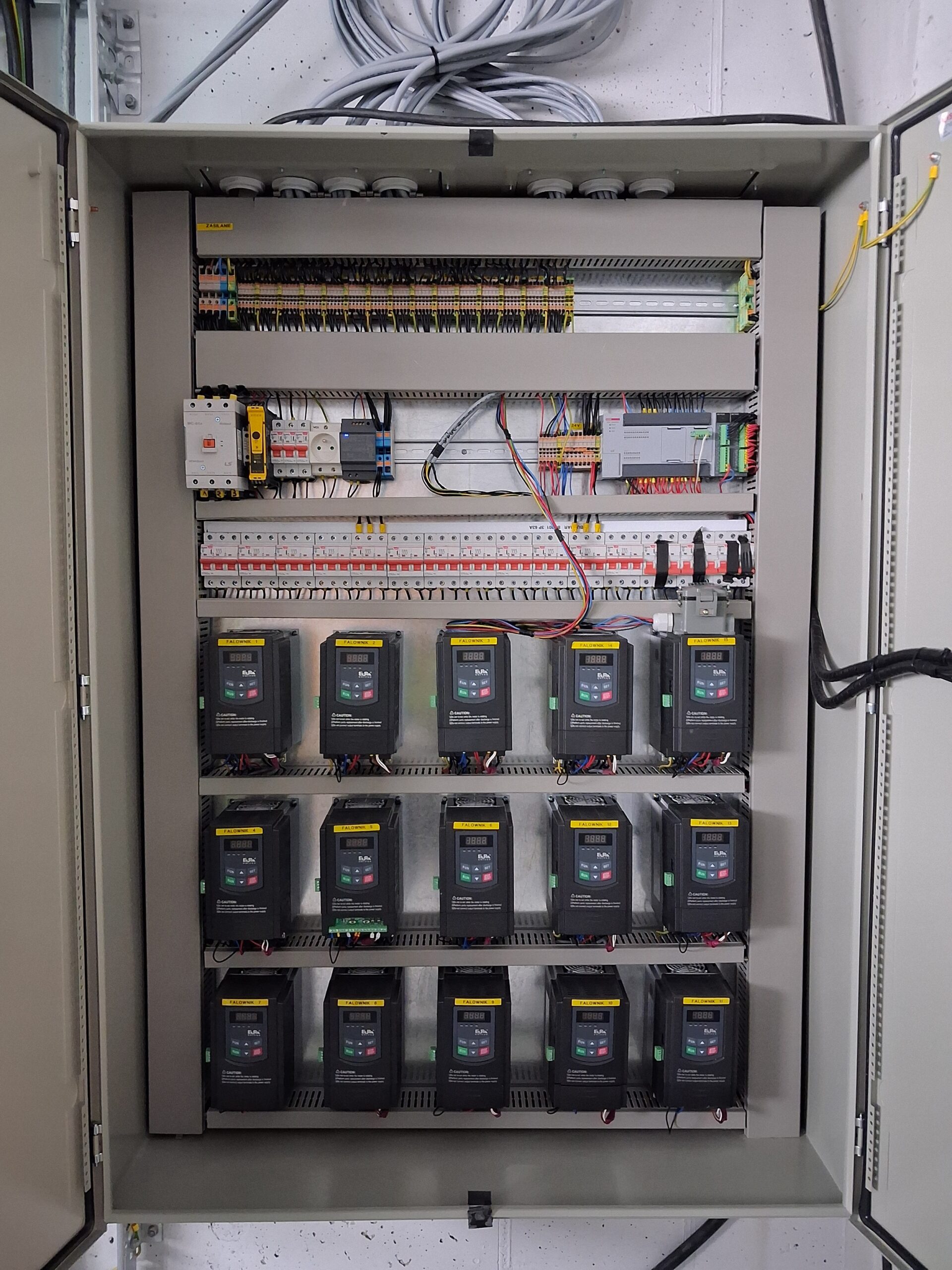 Designed and built a control cabinet equipped with 15 frequency inverters and an LS (LG) PLC to manage the movement of stage battens and bridges. The system was installed at a theatre school in Kraków and provides precise, synchronized control of stage elements. The project included electrical design, PLC programming, inverter configuration, and on-site commissioning.