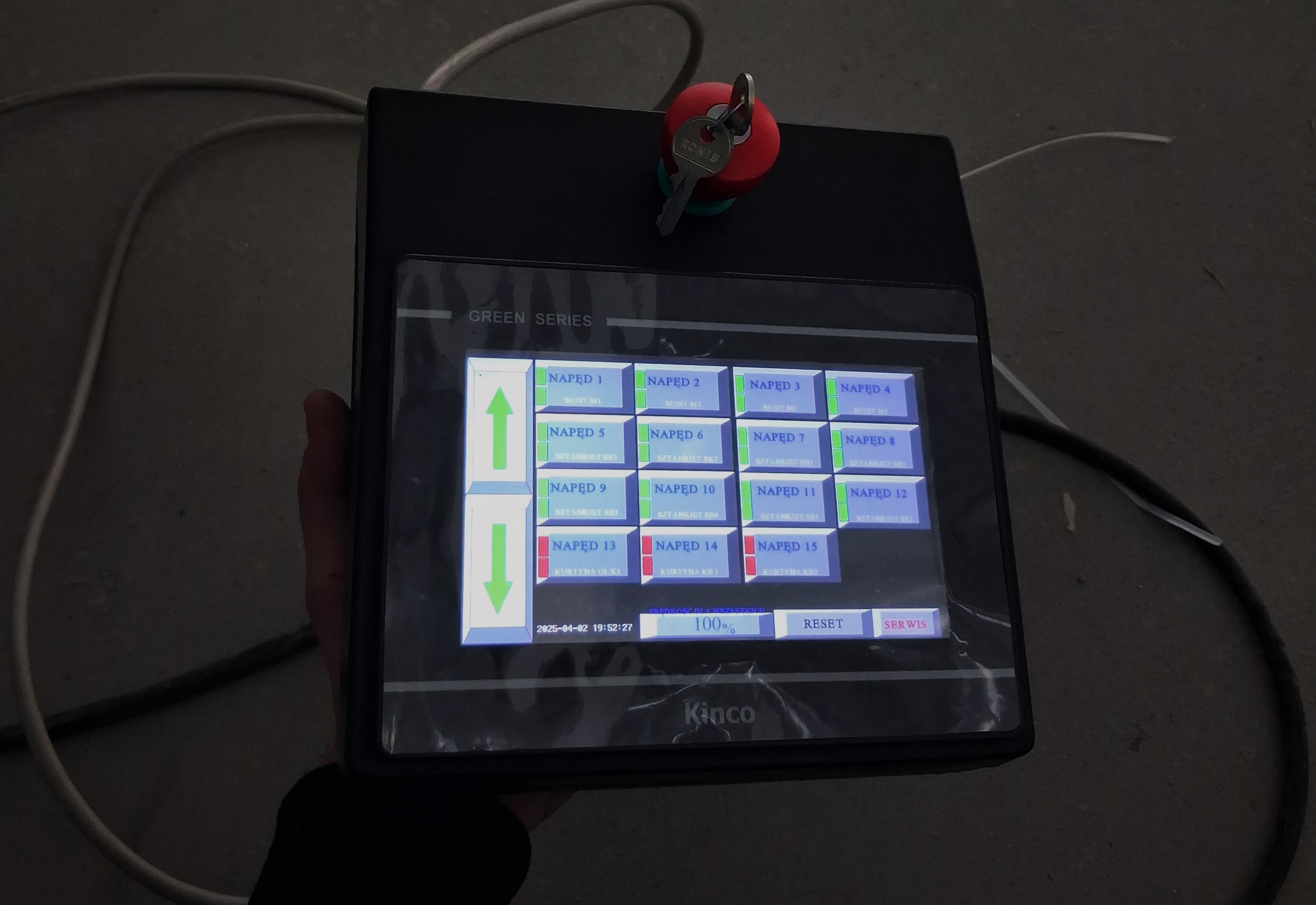 Implemented functionality for selecting individual drives and controlling their movement using up and down arrow buttons. Added an option to set a uniform speed for all inverters through analog control from the PLC. All inverters were connected in series to the PLC’s analog output, enabling synchronized speed control.